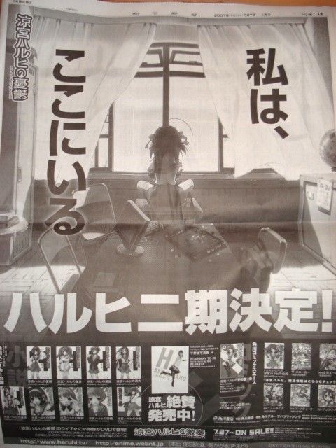そしてやはりやってくれたよ、ハルヒは。 (7月7日朝日新聞より) よりにもよって、7月7日、レナレナの日・・・っじゃなくてっ! 七夕に、だ。 (7月7日朝日新聞より) 涼宮ハルヒ第二期決定! 一日限定映像はこちら↓ 限定でもなんでもないけどね;; ニコニコ恐るべし。 ということで、ハルヒ第二期決定オメ! っていうか、知ったのは昨日じゃなくて今日なわけで。 電気屋に行ってボーっとTV見てたらこなた声のニュータイプCMが流れてて。 「ハルヒ第二期決定」とかいってて。 へ!? って思ったわけさ、俺は。 帰って真っ先にネットで調べるとここがヒット。 画像を見ると7月7日付けの朝日新聞。 うちが取ってるのも朝日新聞。 慌てて昨日の新聞捜すと、あった。 んでその画像が上の二枚というわけです。 ・・・一応保存しとこう、これ。 どうやら正式な情報としては7月10日発売の各アニメ情報誌に掲載されるんだとか。 普段あんまりその手の雑誌は買わないのですが、買っておくか。 ネタにもなるし。 ああ、あと。 涼宮ハルヒPSP、PS2、Wiiに進出! 各サイトはこちら PS2専用ソフト「涼宮ハルヒの戸惑い」(PVがあります) PSP専用ソフト「涼宮ハルヒの約束」 Wii専用ソフト「涼宮ハルヒの憂鬱(仮)」(公式サイトなし、価格、発売日、詳細ともに不明) あーあ。 せっかく持ってたネタだそうかと思ってたけど、これは明日に延期。 まぁ、2006年で終わるヤツじゃ無かったってことだ。 2007年もハルヒはとまらない! とかきれいに閉めてもねぇ。 京アニ的にはらき☆すたとクラナド入ってるでしょう。 多分、今年は無理だろうね。 やるなら来年の春。 それでも早いか。 でも、応援してます京都アニメーションさん! PR 2007.07.07 Sat 16:28:47 俺たちとそういえば今日七夕じゃん。織姫と彦星はたぶん携帯電話を持っている。